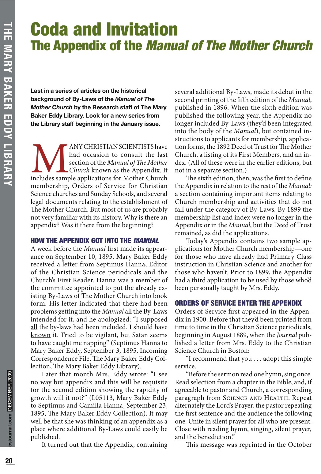 To best answer this inquiry, we can point you toward an article in TheChristian Science Journal that examines the origin of the last section of the Manual of The Mother Church, the Appendix.