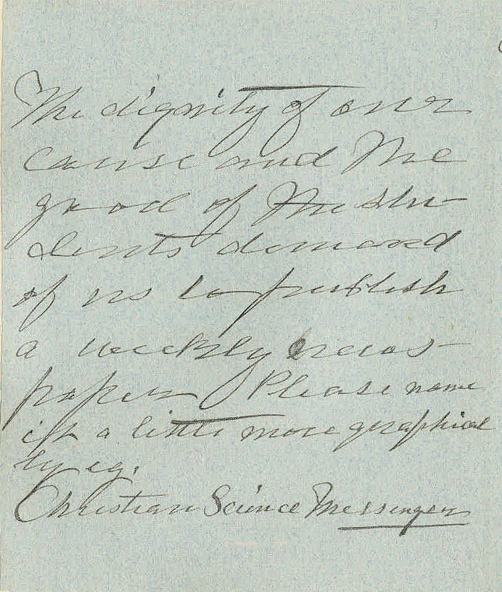 The dignity of our cause and the good of students demand of us to publish a weekly newspaper[.] Please name it a little more graphically eg. Christian Science Messenger.1