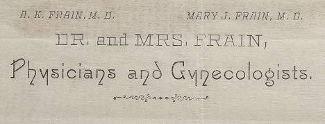Adnah K. Frain (1845–1929) was born in Ypsilanti, Michigan. During the American Civil War, he served as a commissary sergeant in the Union Army. Afterward he earned an M.D. from Michigan Homeopathic Medical College in Lansing, Michigan, in 1873. That same year he married his classmate, Mary J. Frain (Goodell) (1837–1927), in Wood, Ohio, and by 1880 they were living in Spencer, Iowa. Sometime between 1887 and 1892 they moved to Chicago, Illinois, where Adnah Frain was a member of the Chicago Electro-Medical Association.1