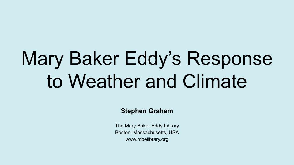 I’m delighted to be here today! This paper is titled “Mary Baker Eddy’s response to weather and climate.”