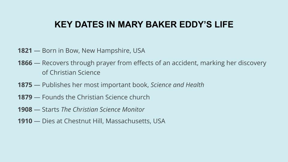 Born in New England in 1821, Eddy grew up in a devout Christian family, attending the Congregational church, where the Bible was central to daily living. Chronic ill health, widowhood, and poverty eventually brought her to her own desperate state. On February 1, 1866, at the age of 44, she sustained critical injuries after falling on the ice, and was thought to be dying. It was then that prior decades of searching for both medical and spiritual solutions culminated in a sudden recovery from those injuries, which appeared miraculous to those around her. It occurred when she turned to the Bible and read one of Jesus’ healings.5