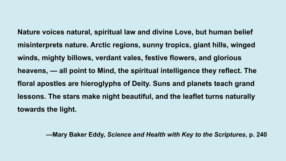 “Nature voices natural, spiritual law and divine Love, but human belief misinterprets nature,” she wrote. “Arctic regions, sunny tropics, giant hills, winged winds, mighty billows, verdant vales, festive flowers, and glorious heavens, — all point to Mind [another term for God], the spiritual intelligence they reflect. The floral apostles are hieroglyphs of Deity. Suns and planets teach grand lessons. The stars make night beautiful, and the leaflet turns naturally towards the light.”18