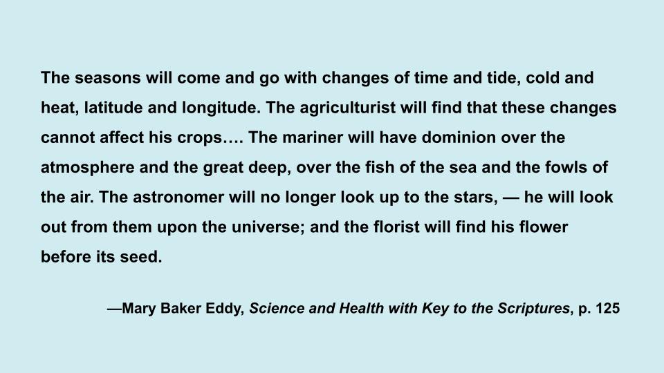 So—what might Eddy have said about the current fear of a climate crisis, in terms of healing? How could her teachings address, in a practical way, the ominous effects of rising ocean temperatures and sea levels? The shrinking polar ice caps? An increase in heat waves, floods, and hurricanes? What do Christian Scientists believe that their religion offers in terms of a valid response to today’s complex atmospheric and geopolitical questions?